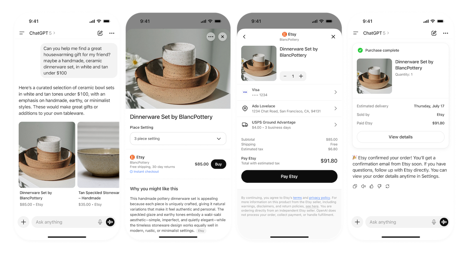 5 – Order confirmation The merchant completes the order through their payment provider, returns confirmation to ChatGPT, and triggers fulfillment. The assistant displays the receipt and keeps the user informed about shipping updates. From the shopper’s perspective, everything happens inside the chat interface.